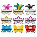 Crafted from durable, eco-friendly plastic featuring intricate glitter designs, elegant feather accents, and other festive embellishments. Each mask is secured with a soft, durable satin ribbon tie.