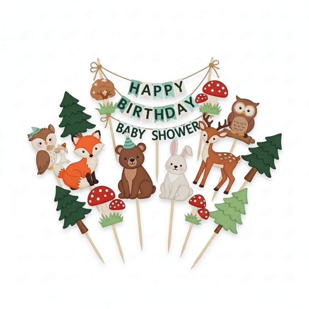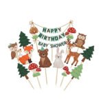 One (1) ‘Happy Birthday’ banner topper, one (1) fox topper, one (1) deer topper, one (1) bear topper, and three (3) decorative tree toppers.